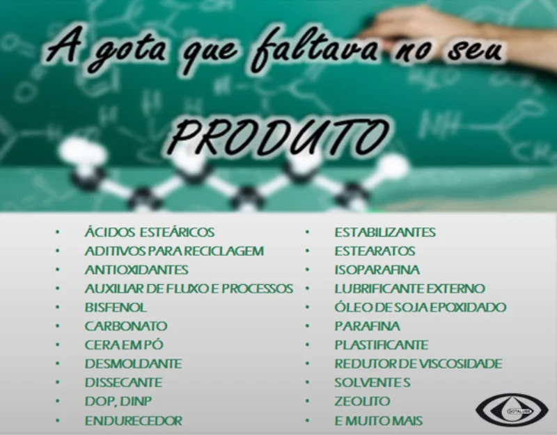 A Gotalube Aditivos Ltda. é fabricante de produtos químicos para transformação de plásticos, borrachas e tintas, com um vasto catálogo de aditivos. Dessa forma, com experiência no mercado desde 1986, a empresa atende a clientes de todas as regiões do Brasil. Para fabricar seus produtos com qualidade, a Gotalube Aditivos Ltda. possui sede de amplo espaço e com avançada unidade de processamento, tudo para oferecer os aditivos produtos químicos às produções de clientes, com ótima garantia de eficiência.